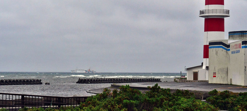 ![]() 「ノシャップ岬」の沖を行くハートランドフェリー。 稚内港7時15分発の鴛泊港行きだ。 |