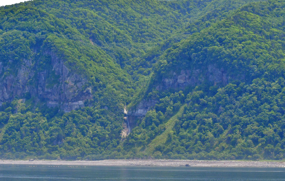 ![]() 知床川の滝をズームアップ。 右岸側の壁には柱状節理が発達しているが,風化が進んでいそうだ。 水量が多いためか,古い溶岩のためか,滝の後退が大きい。 |