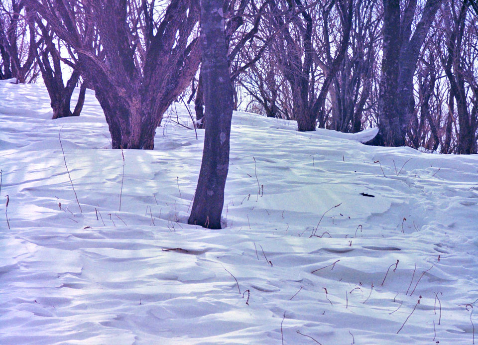 ![]() 鍋割山~小丸間にて。 積雪は多いところで50cm。 1984年2月11日撮影(全て)。 6×4.5版ネガフィルムを2014年1月にリメーク(全て)。 |