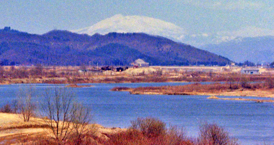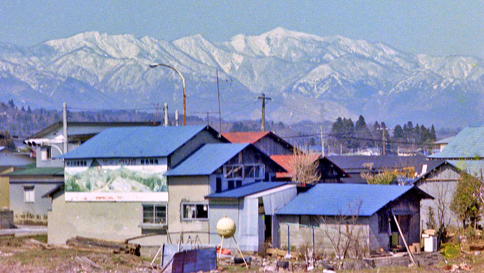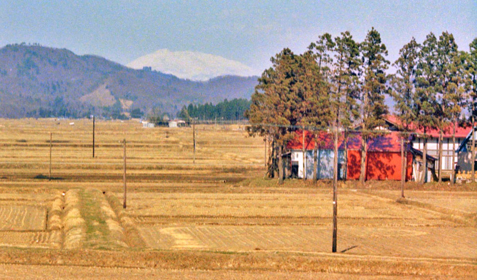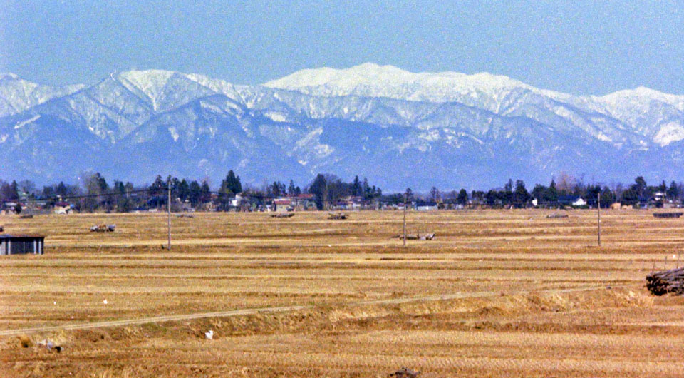 ![]() 中央のピークは和賀岳,やや右のピークは薬師岳。 刈和野駅を通過して暫く後で。 |