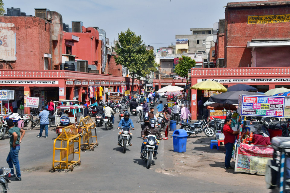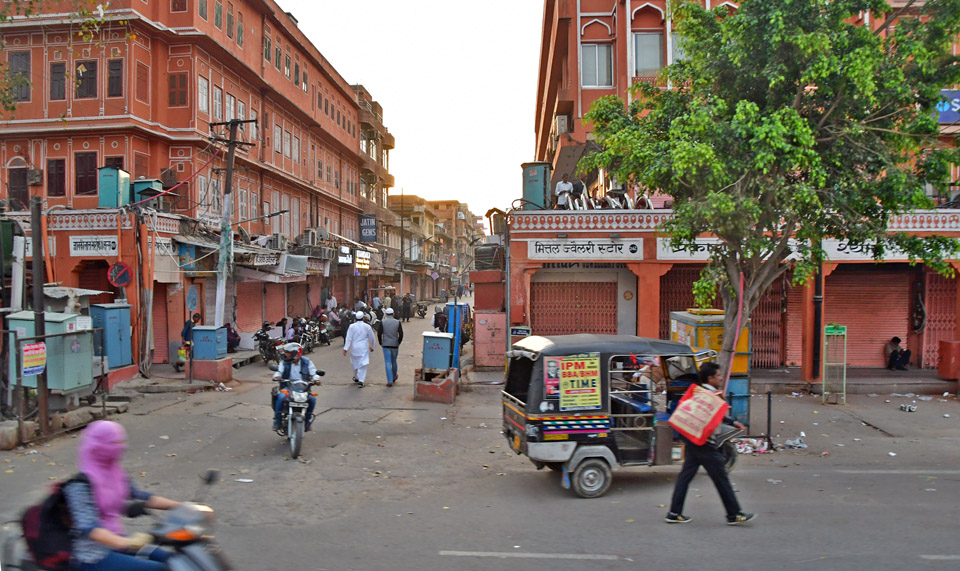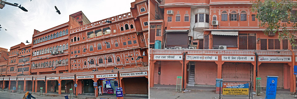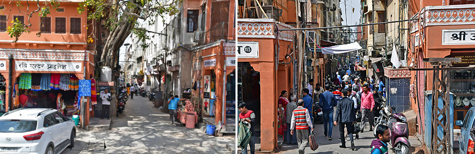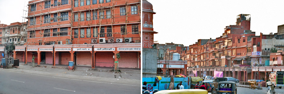 ![]() ピンクシティの商店街。 歩道上には雨よけがあって,他のインドとは何となく雰囲気が違う。 |