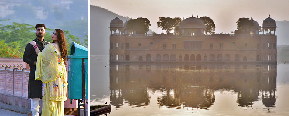 ![]() (右)残念,朝一番の見学のため逆光だ。 階段があることぐらいしかわからない。 (左)「ジャル・マハル」をバックに,結婚式の前撮りが行われていた。 強力なライトを当てないと,せっかくの美人が台無し。 |
