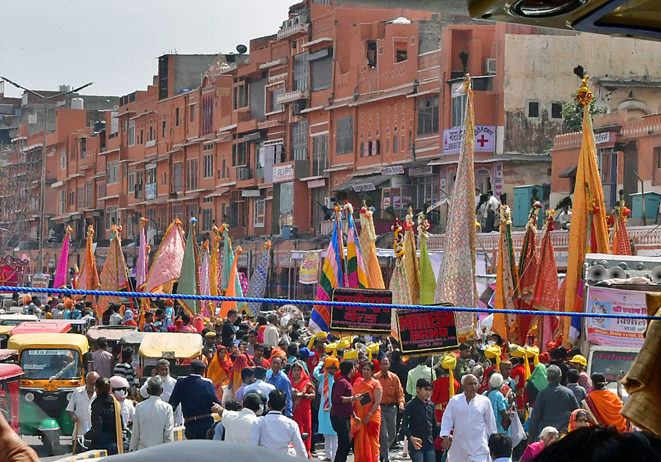![]() 「Mahesh Band」のプラカードがあるので「お祭り」か,それに準ずる行進だろうと勝手に想像している。 後ろの家は全て「ピンクシティ」であり,今後もこの様式を守って行かざるを得ない,とのこと。 見よ!。 表通りには電柱と電線が無いのだ。 |