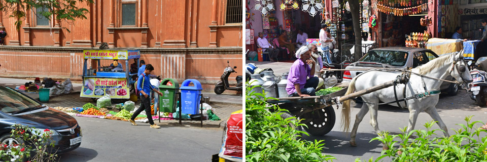 ![]() (左)路上の果物屋。 (右)馬車も平気で通って行く。 |