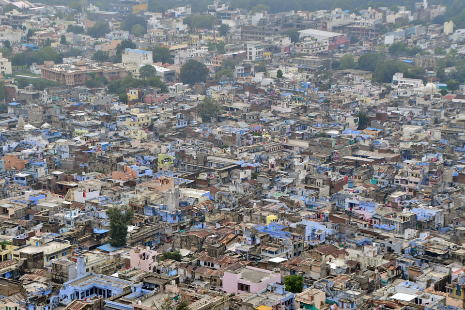 拡大してみた。インドでよく見かける町並みだ。路地が狭く,家々の統一感が無く,雑然としているところネ。 |