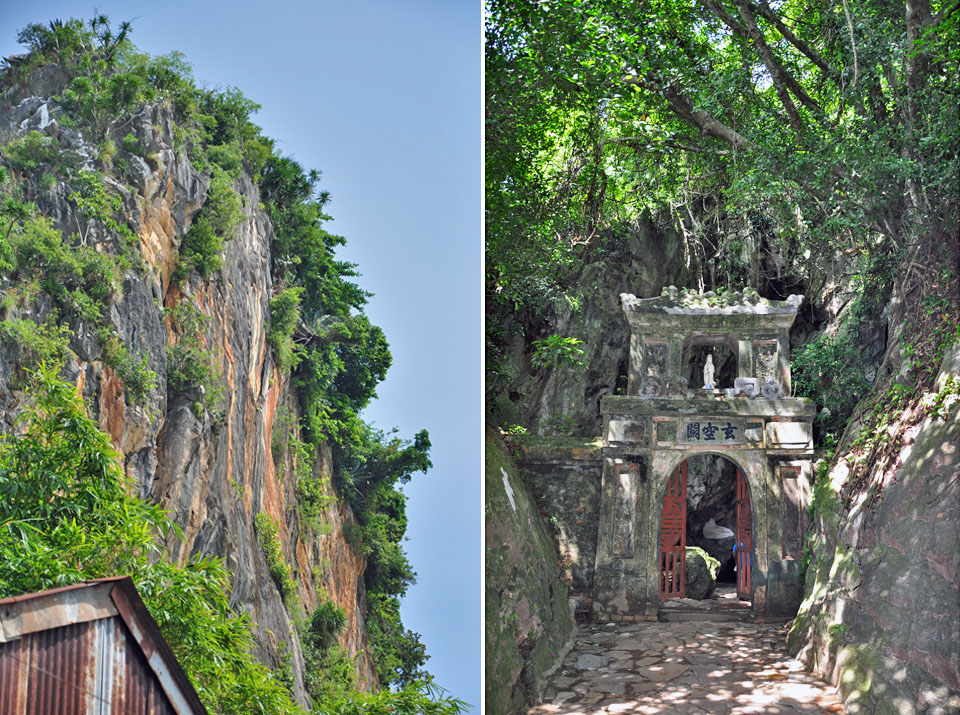 ![]() (左)登山口付近からの「水山」の斜面。 殆ど垂直だなぁ。 (右)ホアギエム洞窟(Hoa Nghiem Cave)の入口にある玄空閣の門。下の地図の⑤で,この奥に⑥がある。 |