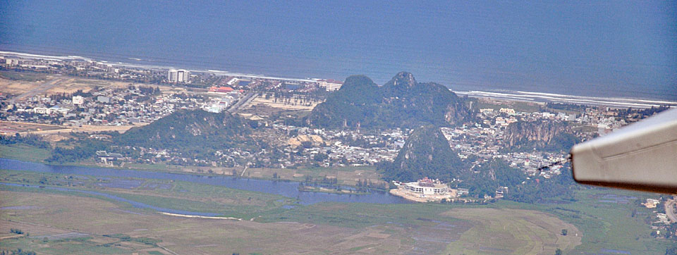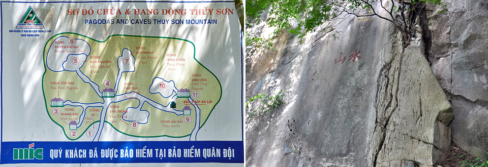 | ベトナム中部ダナン市の南に屹立する「五行山」は,五つの連山から構成されており,ぞれぞれに金,木,水,火と土,と言う宇宙を構成する要素名が 付けられている。 五つの連山の中では,写真の「水山」が最も大きな規模であって,下左の地図のように5箇所ほどの鍾乳洞が存在する。 |