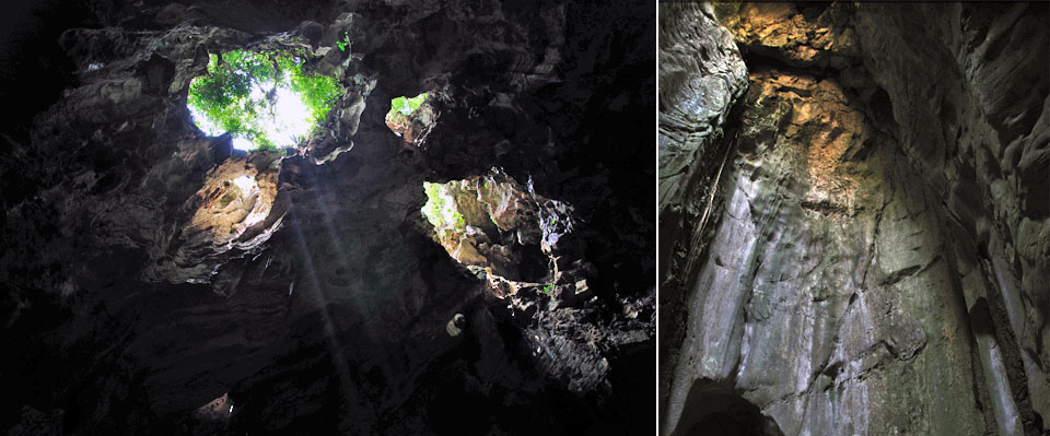 ![]() (左)その米軍が落とした爆弾による穴。 (右)フィエンコ洞窟の内壁。 少しドームになっているようだ。 |