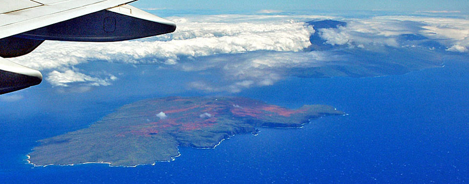 | カホオラウェ島は,緑色の原生林と赤色をした表土の2色だった。 表土は,昔米軍の演習地だったことや,しばしば干ばつが発生するためと言われている。 緑色は,自然を回復しようという運動の成果らしい。 マウイ島は雲が厚いが,最高峰のハレアカラ山の山頂(3055m)だけは,雲が切れていた。 |