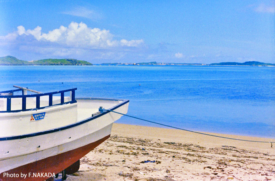 | 大神島のページにも書いたように、40年前にはこの池間大橋は無かったのだ。 砂浜に漁船が挙げられているところを見ると、現在「狩俣漁港」とされている施設もなかったのかもしれないなぁ。 いずれにしても、宮古島の周辺は浅瀬が多く、ラグーン特有の黄緑色の海が普通なのだが、40年前のネガフイルムでは唯々青色一色のみだなぁ。 画像は全て、35mmネガフィルムを2014年4月にデジタルリメイク。 |