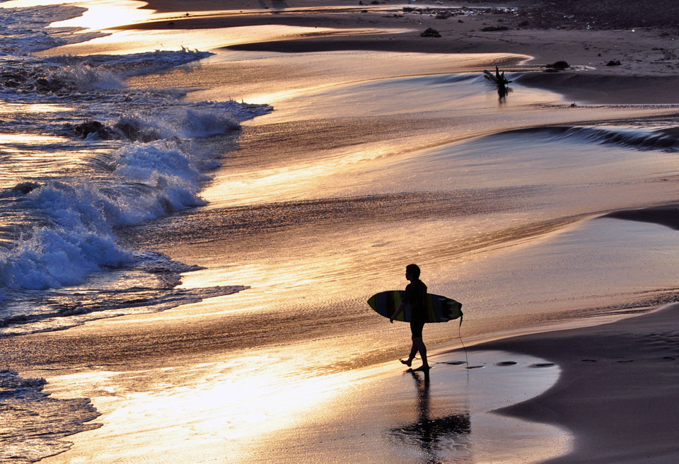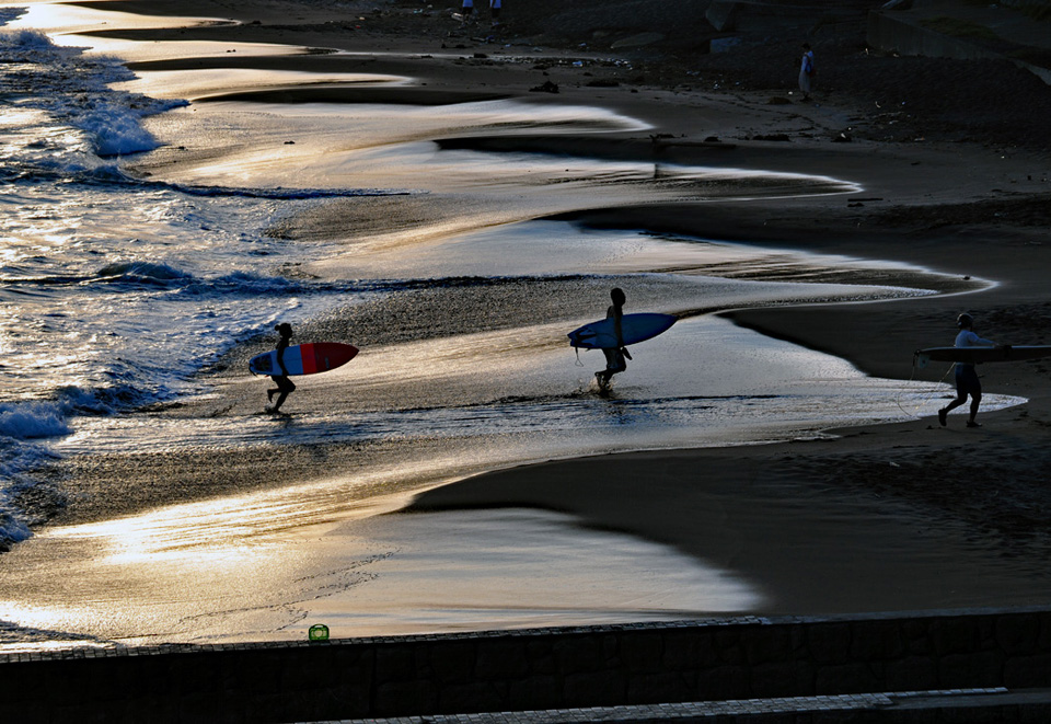 | 8月上旬頃、七里ヶ浜からの七里ヶ浜の夕景は、太陽の高度と位置がパッチリ。 寄せる波はやや青く、海に戻る水は金色に染まる。 朝早くから漕ぎ出す?サーファーも入れば、まもなく日没,と言う頃になってから海に入るやつもいて,人間ウォッチングには最適かもしれないなぁ。 |