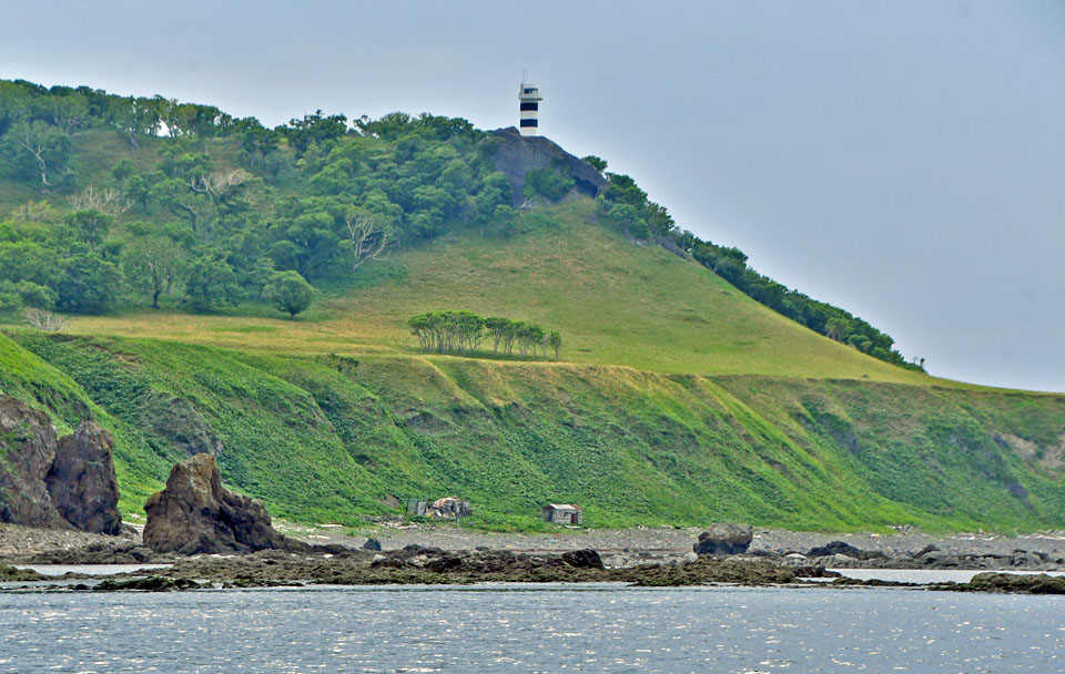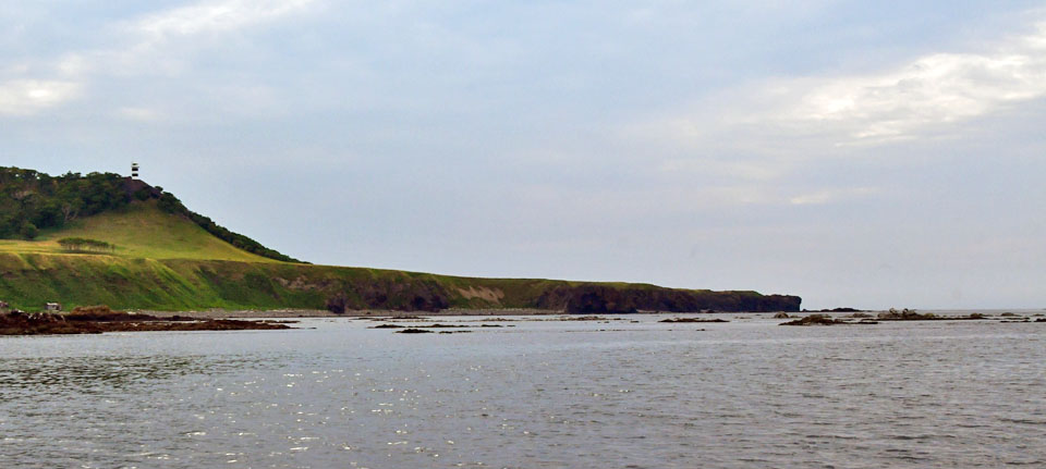 ![]() 羅臼側からの知床岬と灯台。 海岸段丘が広がっている。 |