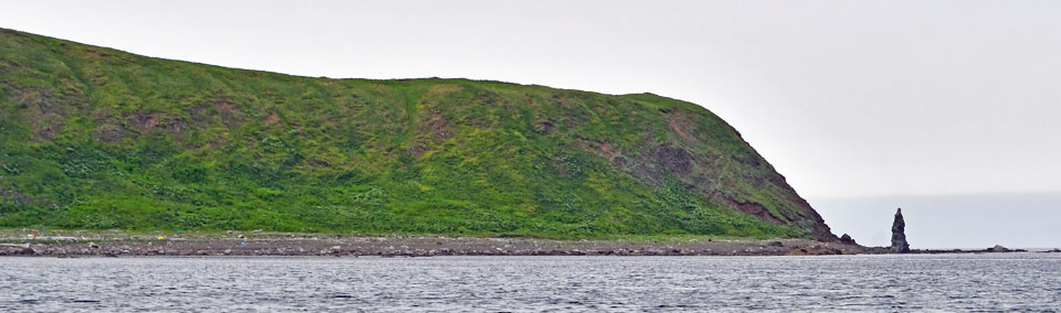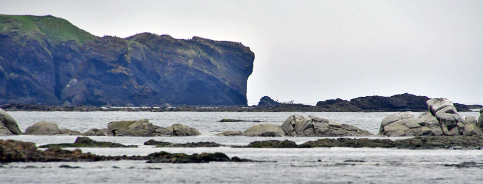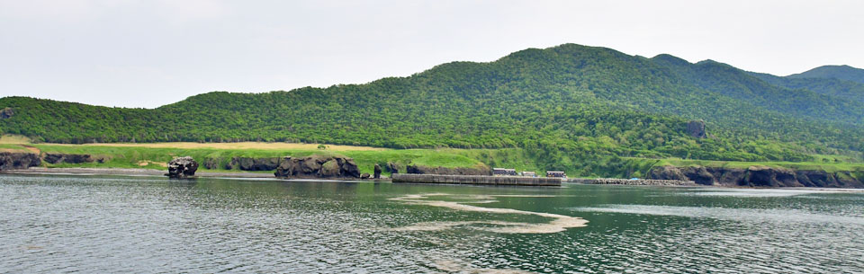 ![]() 知床岬近くの羅臼側のほぼ全景。 岬の先の沖合まで,結構岩礁が広がっているが,冬の流氷で頭が削られているものが多いそうだ。 |