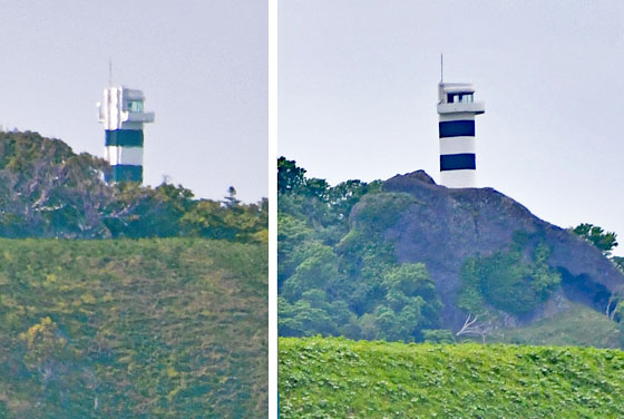 ![]() ウトロ側からの知床岬と灯台。 羅臼側は霧が濃かったが,一瞬,霧の上に国後島が見えた。 爺爺岳(1772m)あたりだろうか?。 |