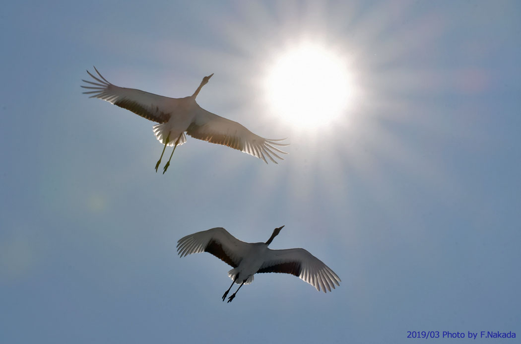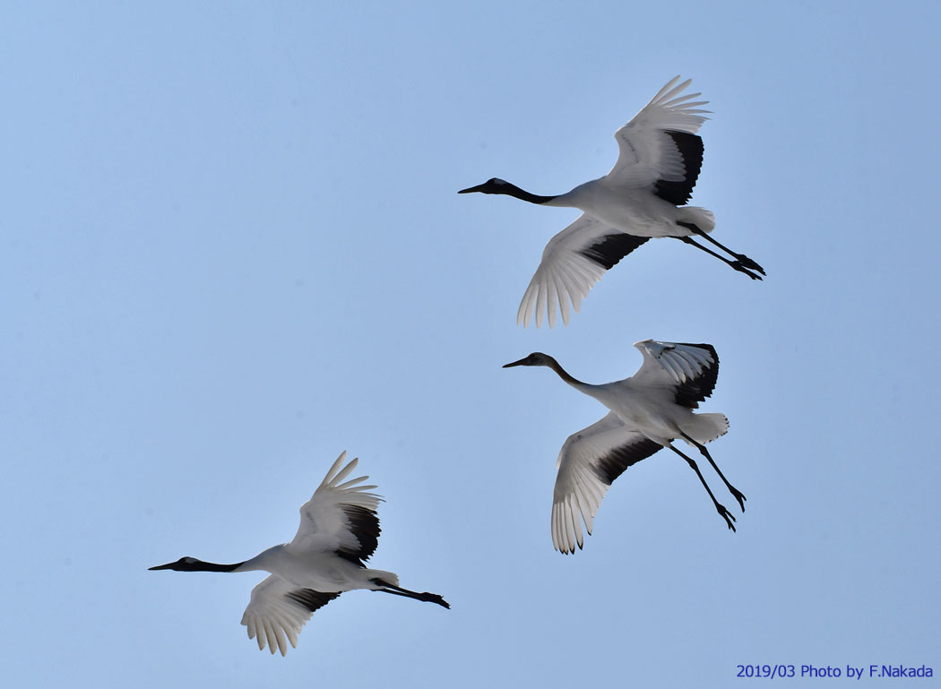 ![]() 青空を飛翔するタンチョウ。 先頭は,頭が茶色い子供で,後ろは母親か父親なのだ。 |