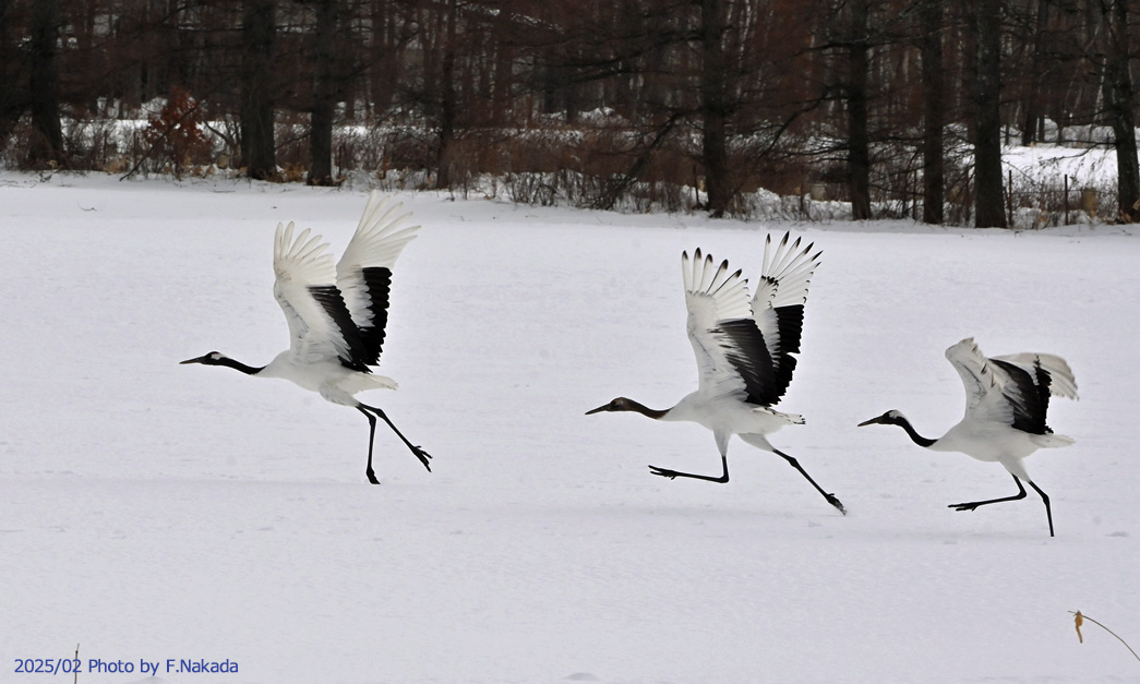 ![]() ![]() 「さぁ,行くよ。」とばかりに走り出す3羽。 先頭は父親で,最後は母親,真ん中は去年生まれた子供なのだ,多分。 |