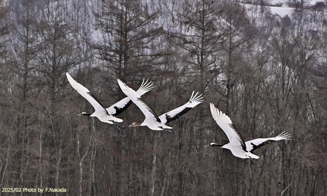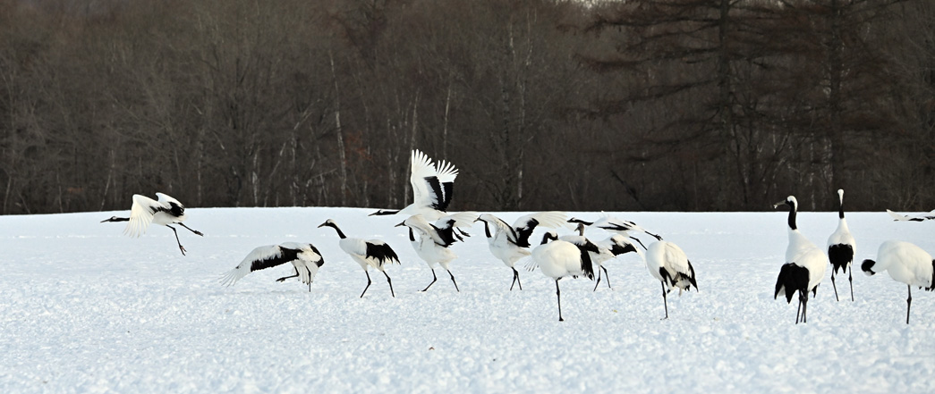 ![]() 給餌場に到着。 着地寸前のタンチョウもいるし,まだまだ先に行くぞ,もいるのだった。 飛翔中のタンチョウは13羽。 |