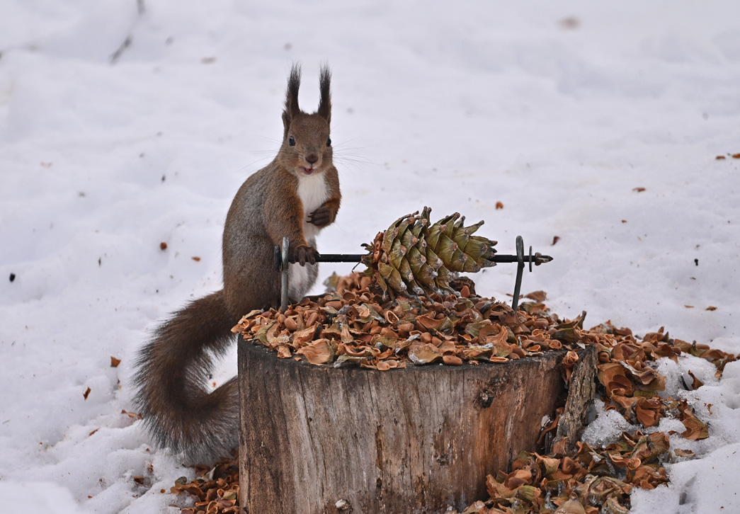 ![]() 「ホテルタイト」の庭。 切株の上にはエゾリスの給餌場が設けられていて,折から食事中だった。 右手がいいね! |