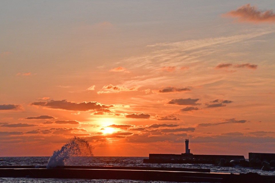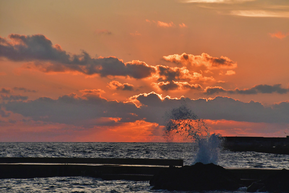 ![]() 底土海岸の防波堤に押し寄せる波の向こうに,陽が昇った。 撮影:2019年10月1日5時41分。 |