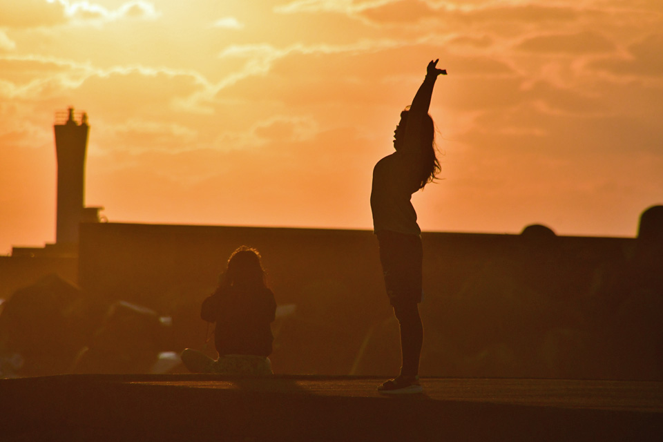 ![]() 陽が昇ると,三々五々,観光客らしき人達が防波堤に集まってきた。 撮影:2019年10月2日5時52分。 |