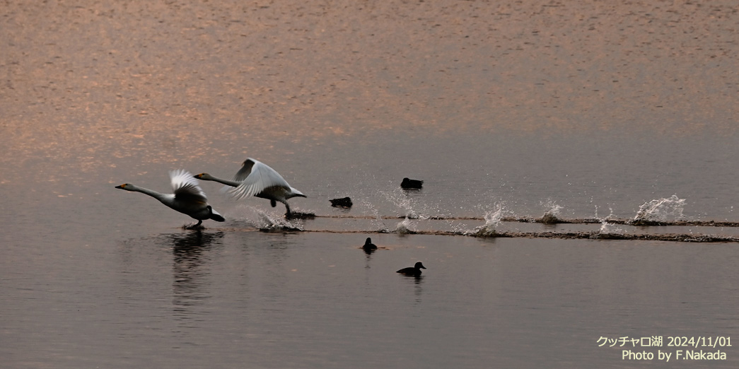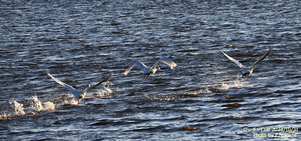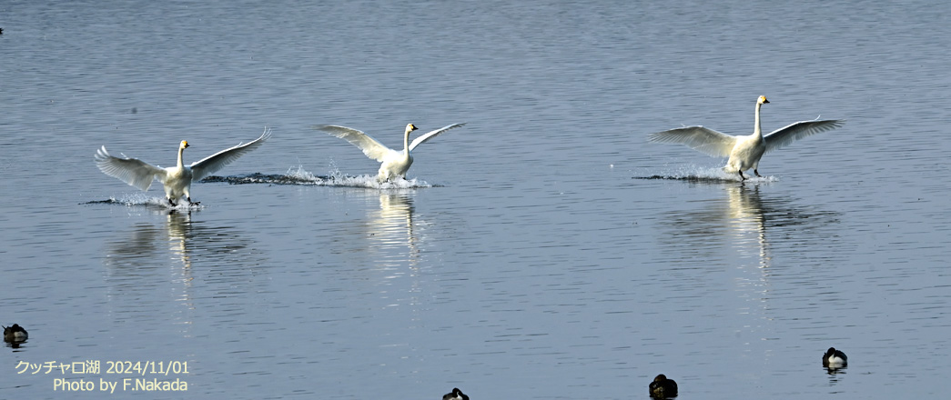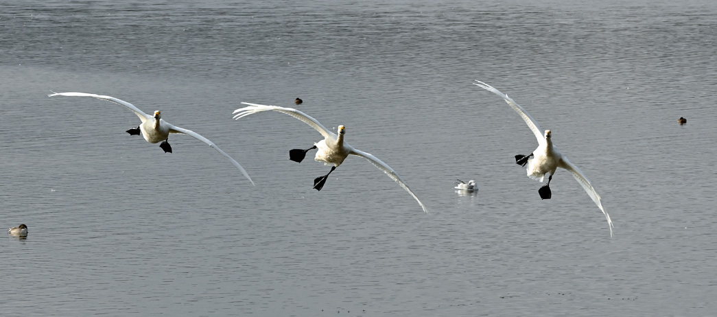 ![]() 白鳥(コハクチョウやオオハクチョウ)は,体が重いので,離水するまでにはかなりの助走が必要なのだ。 また,大きな水かきがついているため,助走にあたってはかなりの水音を立てるので,こちらが素早く対応すれば何とか撮影に間に合うのだった。 |