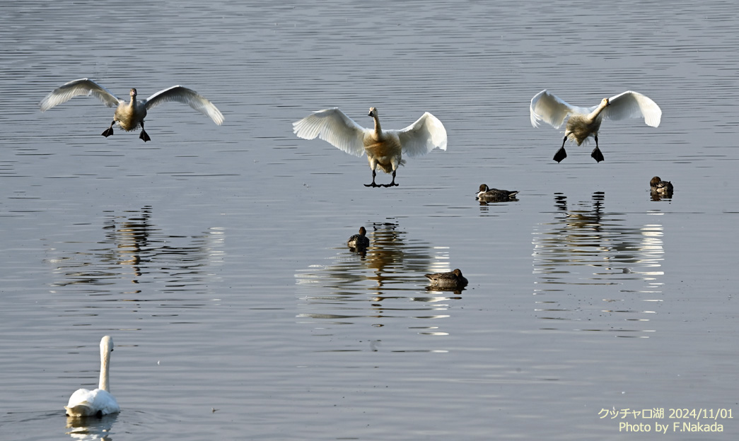 ![]() 成鳥の「コハクチョウ」が三羽。 真ん中のは去年生まれた子供のような気がするが,自信は無い。 |