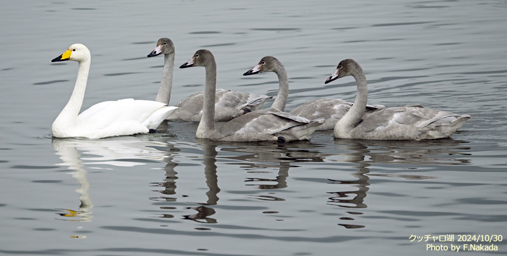![]() これはクッチャロ湖には珍しい「オオハクチョウ」の親子。 この母親(多分)は実に4羽の子供を連れていたのだ。 それにしても,7月にシベリアの北極圏で生まれ,生後約3ヶ月でクッチャロ湖まで飛んでくるのには驚かされる。 |