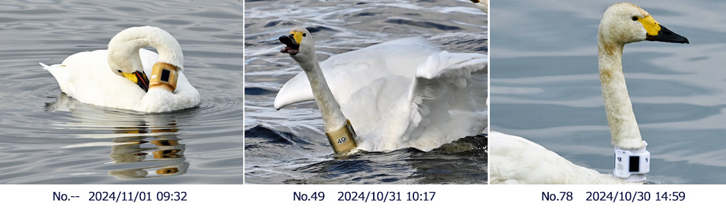 ![]() どこの機関が装着しているのかわからないが,何れもGPSと送信機を装着させられている3羽のコハクチョウ。 |