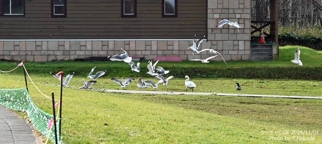 ![]() 後の建物は「水鳥観察館」。 その職員が決まった時刻に白鳥にパンをあげているが,このように,カモメに横取りされることも多いのだ。 |