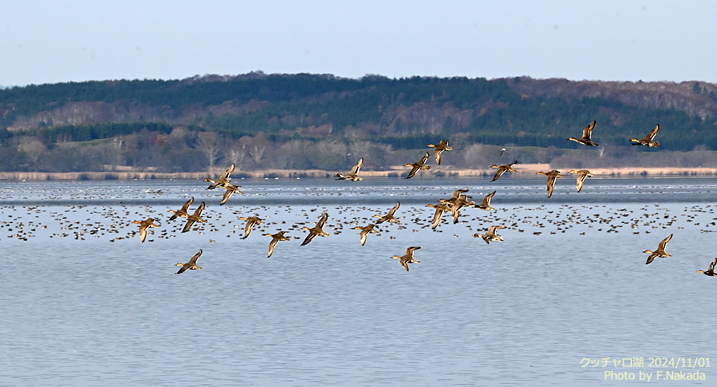 ![]() 飛翔する「オナガガモ(多分)」。 水面には数万羽のカモ類が羽を休めているが,遠すぎて種類の特定はできなかった。 |