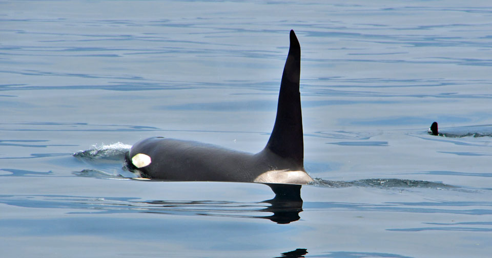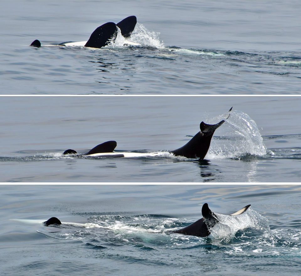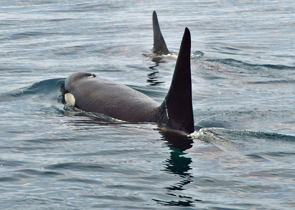 ![]() 先行するシャチに続いて,潜水間近の雌のシャチ。 |