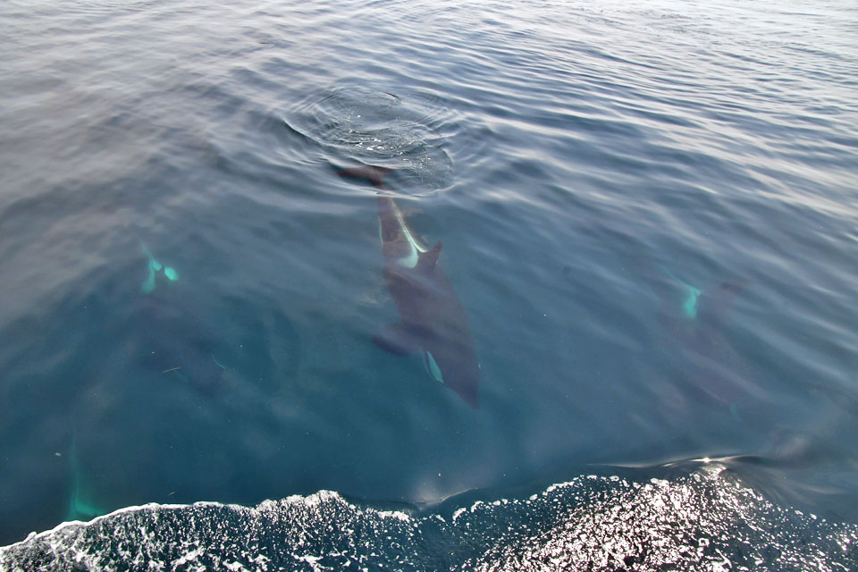![]() 子供が母親に甘えている。 背びれからみて,全部雌とのことだった。 |