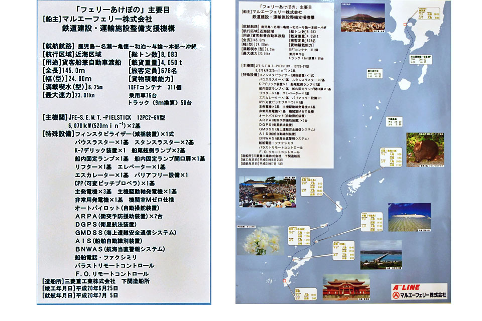 | このスライドは、2018年5月に初めて鹿児島新港から那覇港まで,マルエーフェリー(A”Line)が運行する「フェリーあけぼの」に乗船したときの記録です。 途中、奄美大島(名瀬港)、徳之島(亀徳港)、沖永良部島(和泊港)、与論島(与論港)と沖縄本島北部(本部港)に寄港し、乗船時間は丁度25時間でした。 時刻表は以下の通りです。 鹿児島新港[18:00]⇒ 名瀬港[05:00;05:50]⇒ 亀徳港[09:10;09:40]⇒ 和泊港[11:30;12:00]⇒ 与論港[13:40;14:10]⇒ 本部港[16:40;17:10]⇒ 那覇港[19:00] |