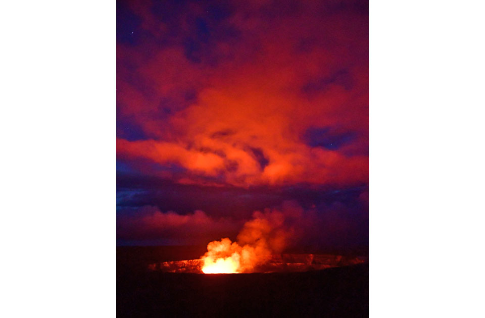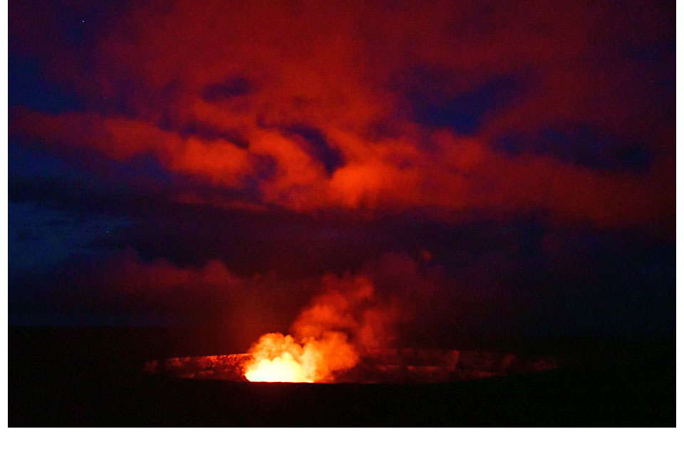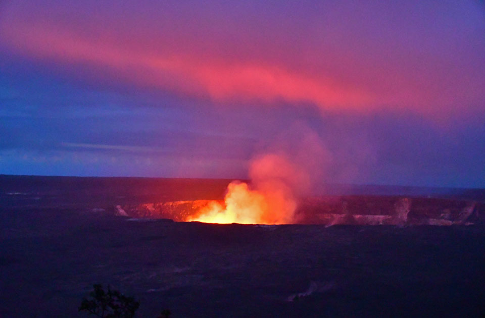 | ALOHA KONA TOURS が主催する「ボルケーノ鑑賞ディナーツアー」に参加した。 色々見学した後,夕暮れ前のジャガー・ミュージアムで,キラウエア火口の全容と同火山の開設を聞いた後,レストラン「ザ・リム」で夕食を食べた。 夕食後フト外を見ると,火口がほんのり赤く染まっているでは無いか。 ツアー客全員が思わず外に出て眺めたり,写真を撮ったり。 その内に,出発の声で再びジャガー・ミュージアムへ向かうが,車で大渋滞。 結局,ジャガー・ミュージアム駐車場には入れず,手前の臨時駐車場に停車。 しかし,こちらの方が赤く染まった火口や大噴煙を見るのには都合が良かった。 いわば絶景でしたね。 その光景をどうぞ。 |