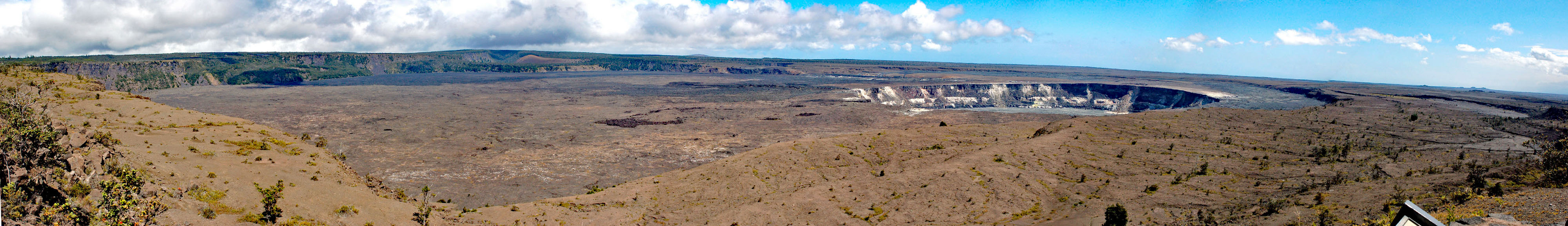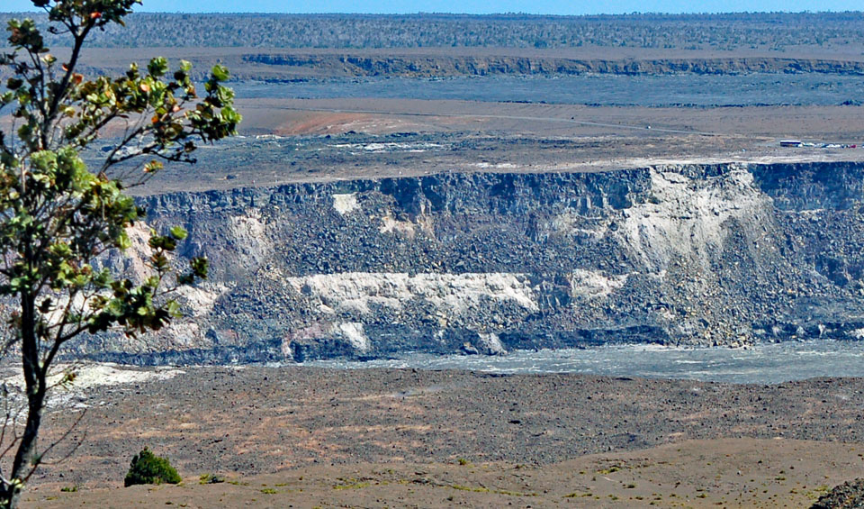 ハレマウマウ火口の拡大。 右下のオレンジ色の部分は,溶岩プールだと思う。 撮影:ジャガー・ミュージアム近くにて,2017年6月下旬。 |