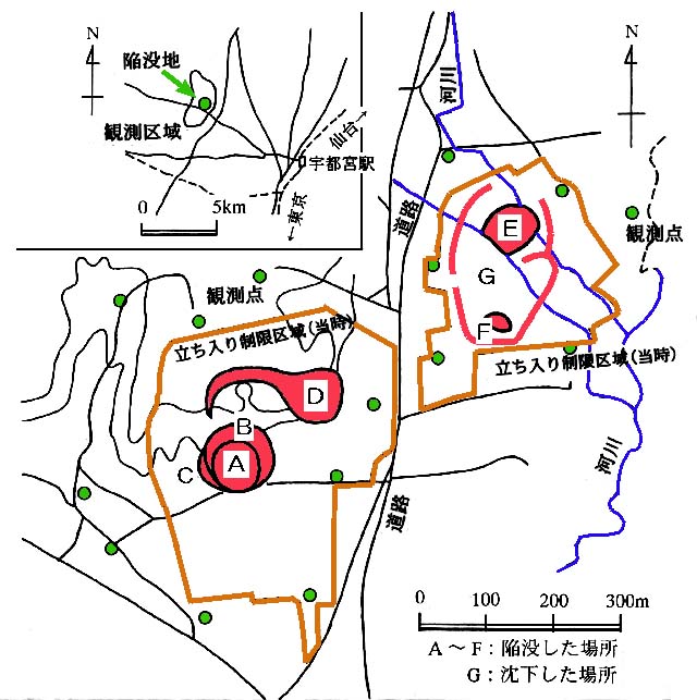 栃木県の調べによると、最近の35年間に大谷石の採取場の陥没事故は22ヶ所にのぼり、その中の最大は1955年7月11日に発生した面積20,000uの陥没であった。 図−3はこれらの陥没のうち、最近の3ヶ所の陥没の発生場所を示した。 また、表−2はそれぞれの陥没の規模である。